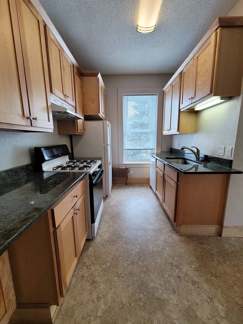 Gorgeous studio for rent in classic historic brownstone off Grand Ave. Rent is $989 and includes, heat, water, trash and FREE WiFi! This is a unique apartment that features everything you love in a vintage building and everything you need in a modern building. Beautiful hardwood floors, 12 ft ceilings, floor to ceiling windows, large closets, and a newly renovated kitchen & bath. The full sized kitchen is complete with custom granite counters, new hickory cabinets & appliances, self-cleaning gas stove, dishwasher, and stainless sink with detachable sprayer. The bathroom has been renovated with full tile surround, built-in shelving, pedestal sink, all new fixtures and mounted cabinets for extra storage. Very cute and very clean! Well laid out to maximize usage and square footage. Additional storage room available complimentary in basement.